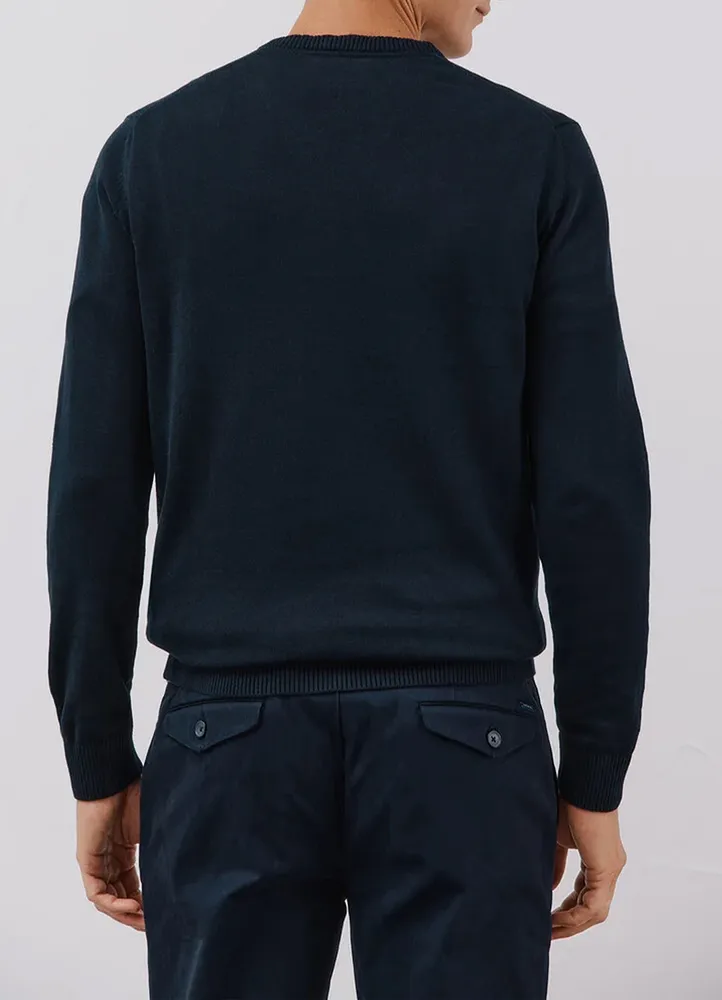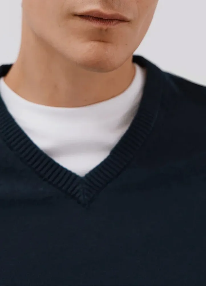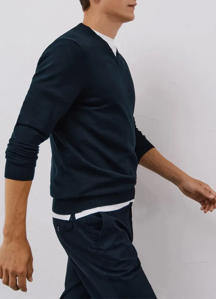 Long sleeve, V-neck, regular fit, plain sweater featuring a ribbed finishes.
