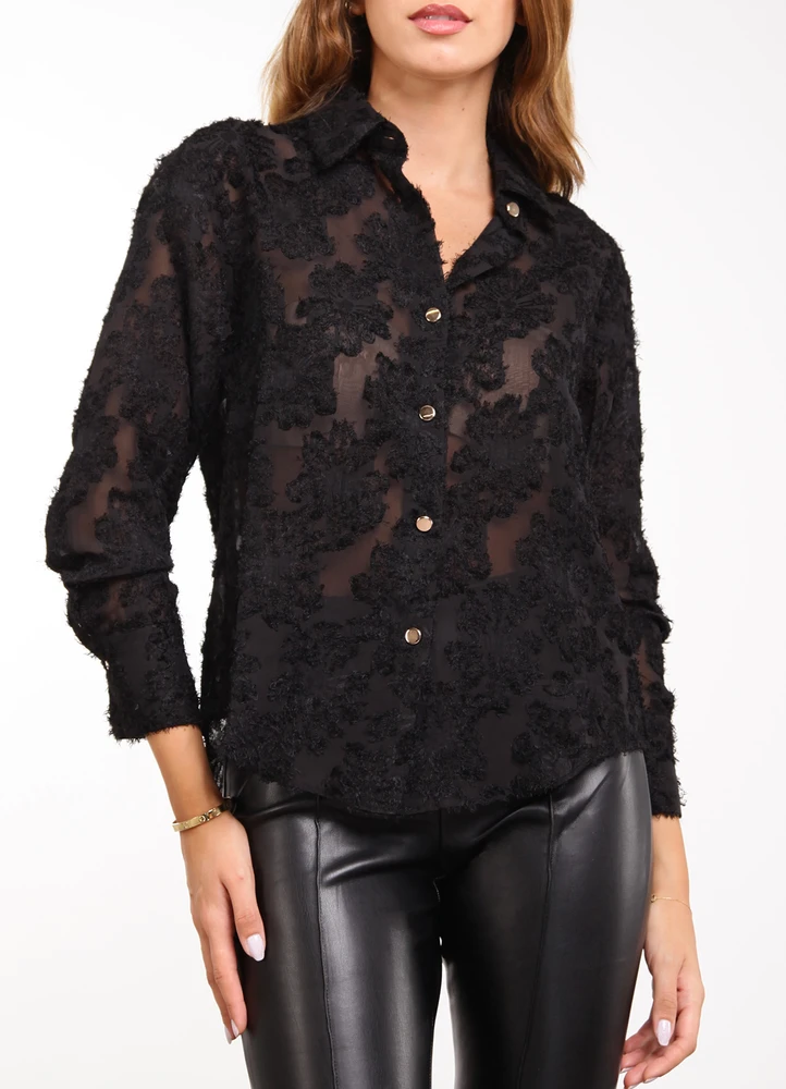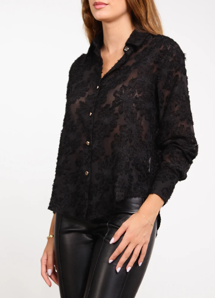 LS semi sheer structured shirt with fuzzy embroidery & golden buttons