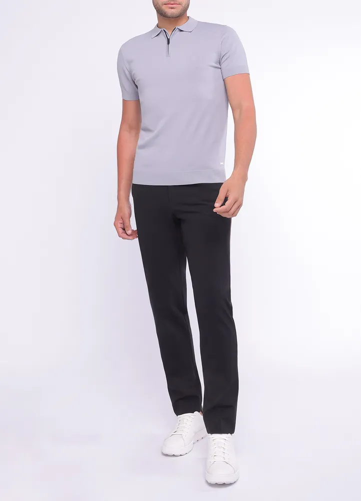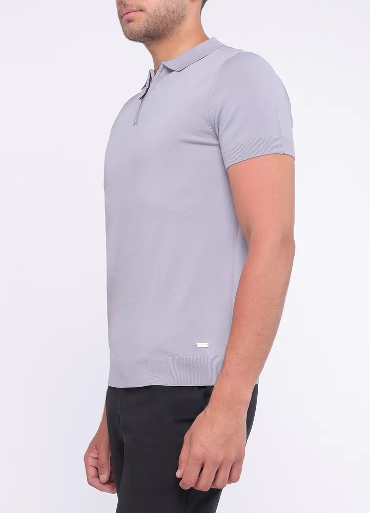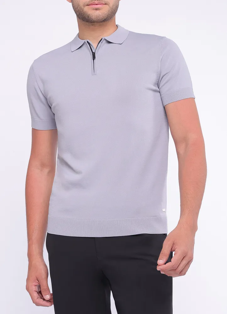 Short sleeve knitted half zip poloshirt with elastic waist featuring Maison Brown metal branding on bottom.