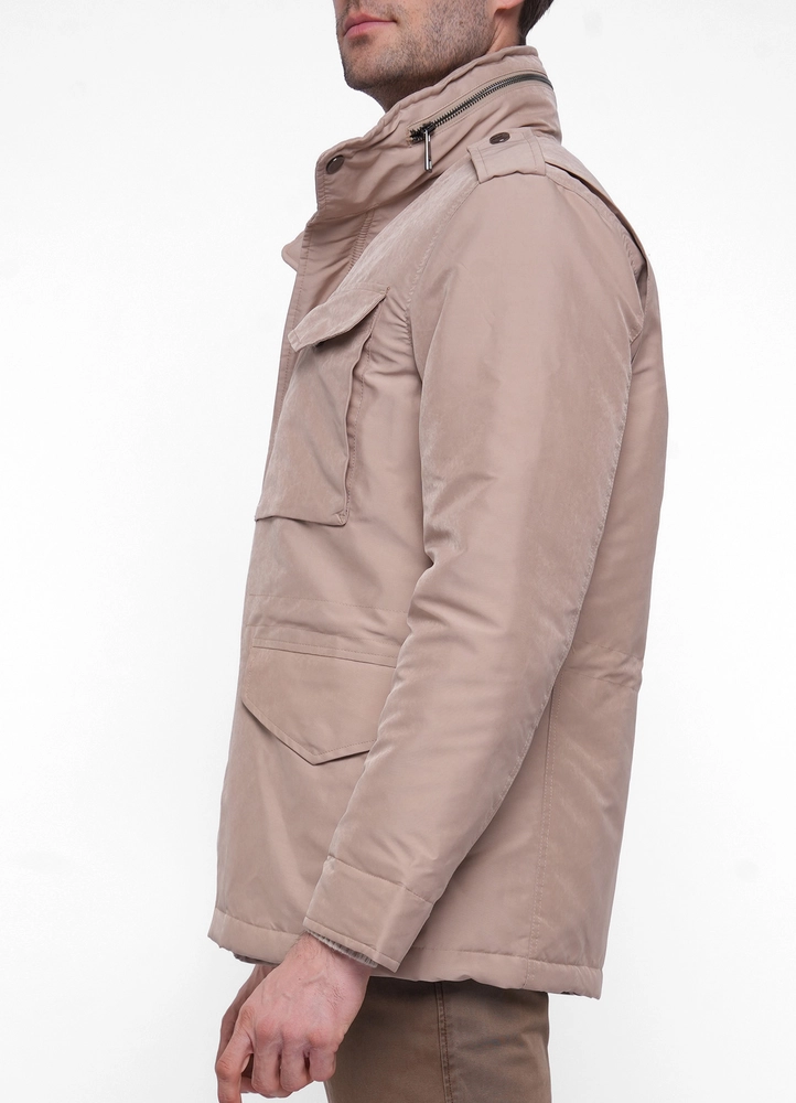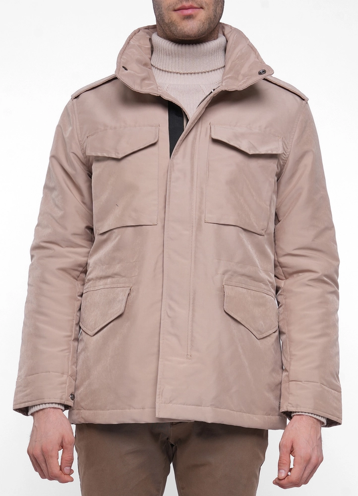 Outdoor plain military short jacket with invisible hood and four front pockets.