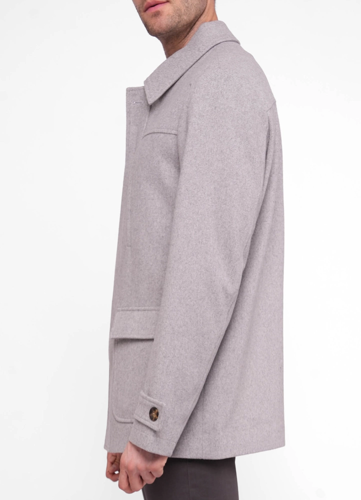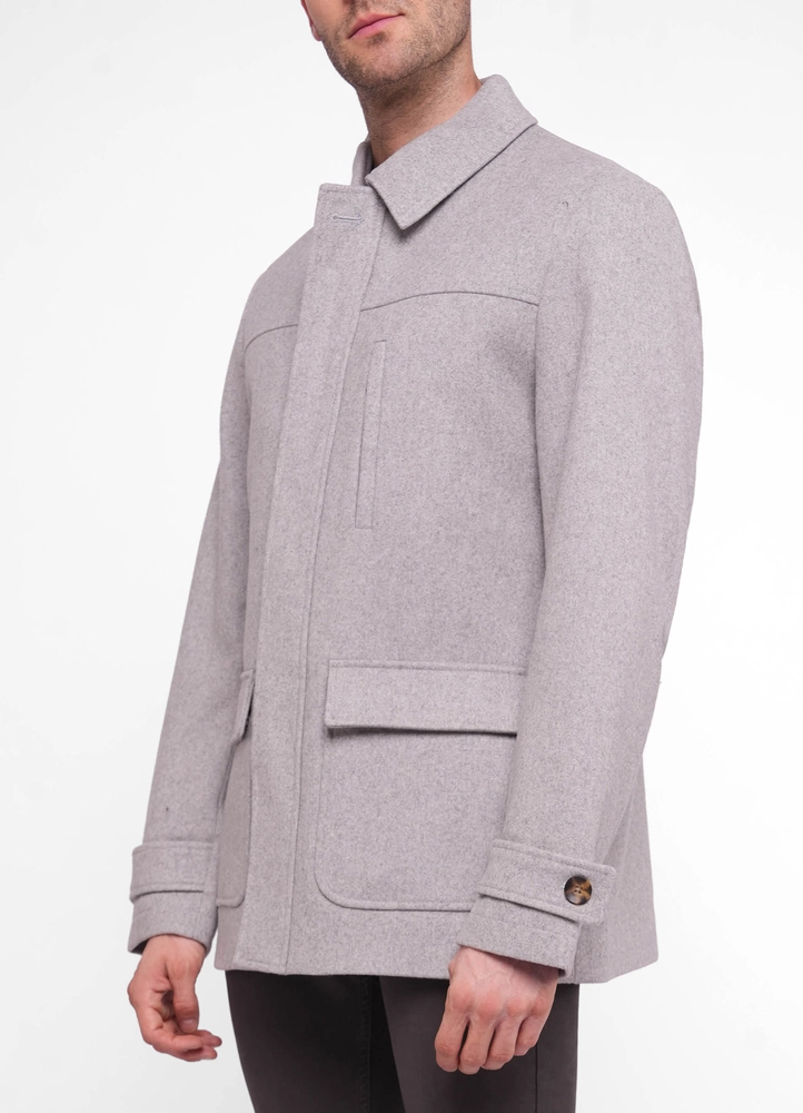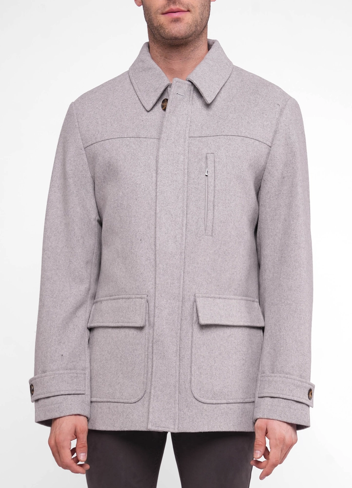 Lio outdoor wool coat with two patch pockets and zipped pocket on chest and collar.
