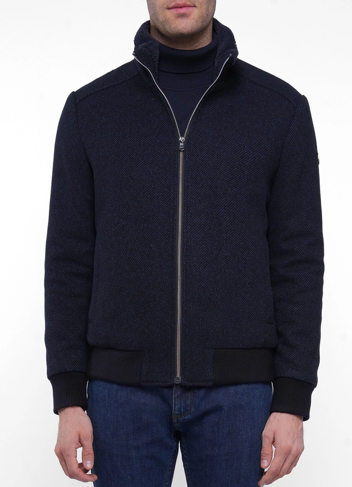 Outdoor wool mix diagonal short jacket with fur collar.