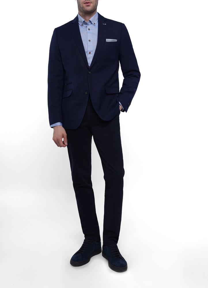 Structured sport coat with flap pockets and coin pocket.