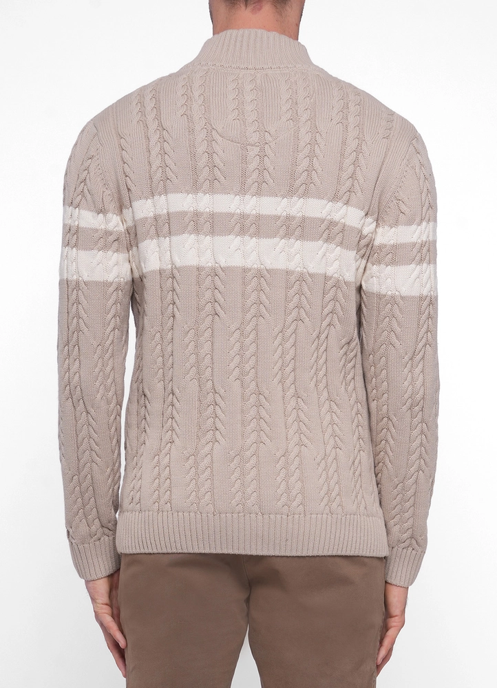 Half zip cable knit sweater with front stripes.