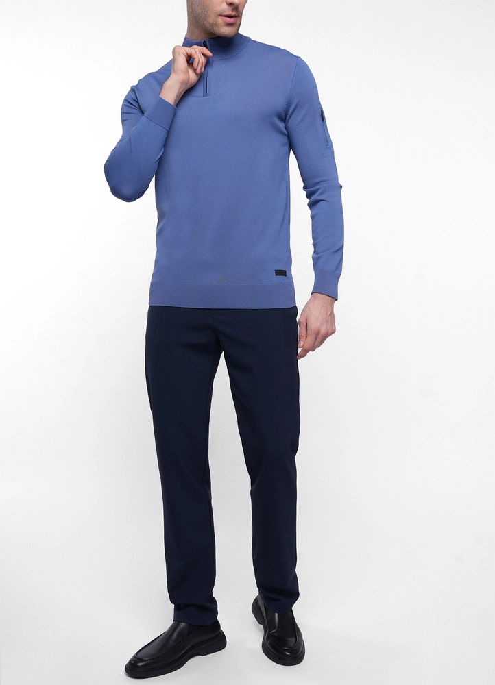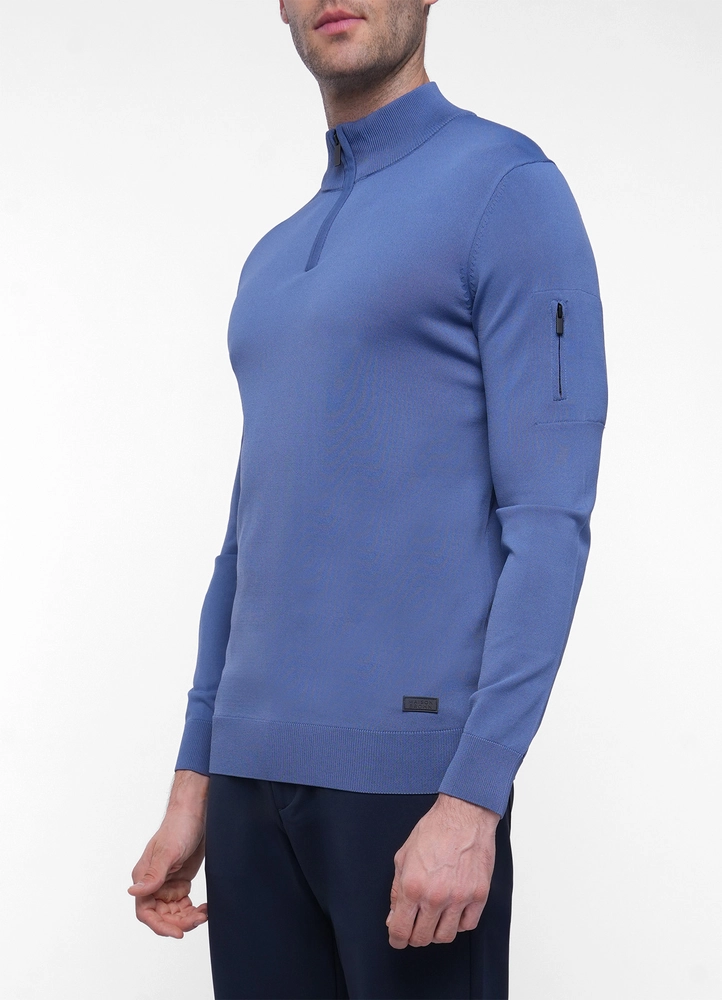Technical fabric half zip sweater stretch with zipped pocket on arm.