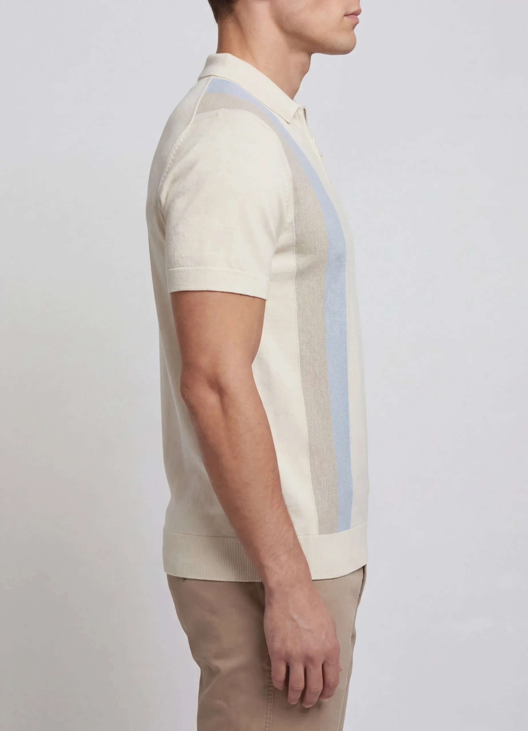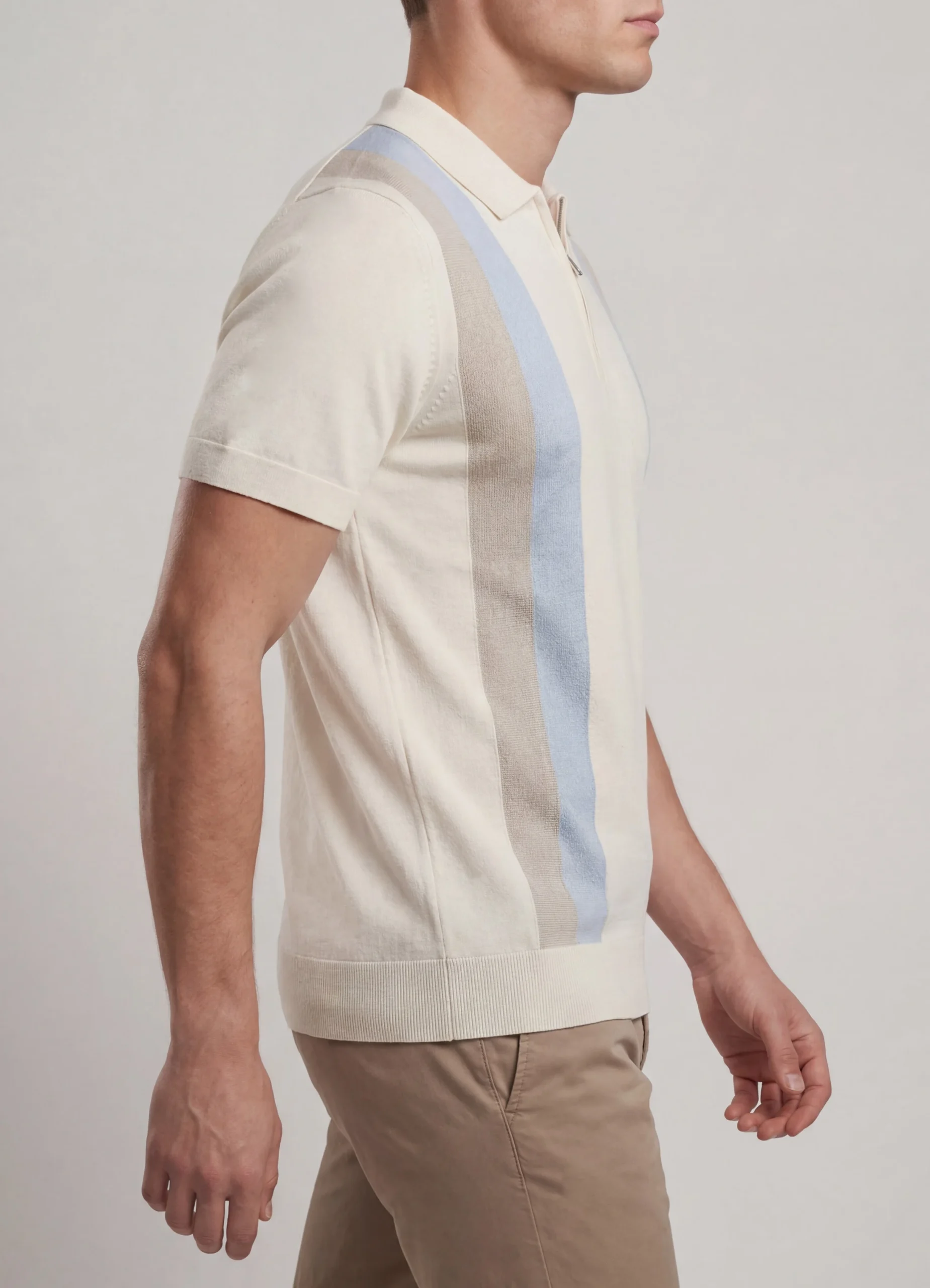 Short sleeve knitted tricolor vertical striped half zip poloshirt.