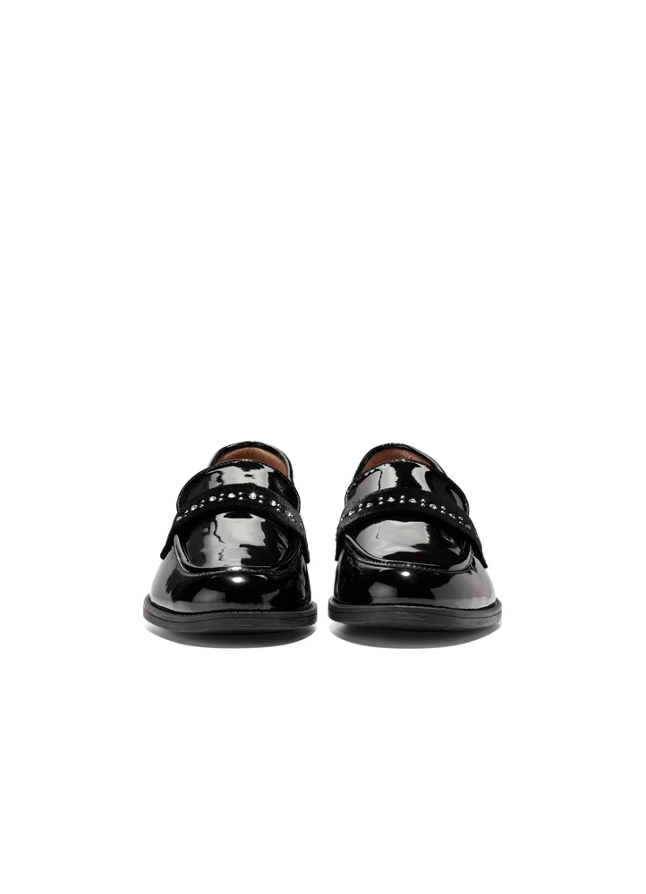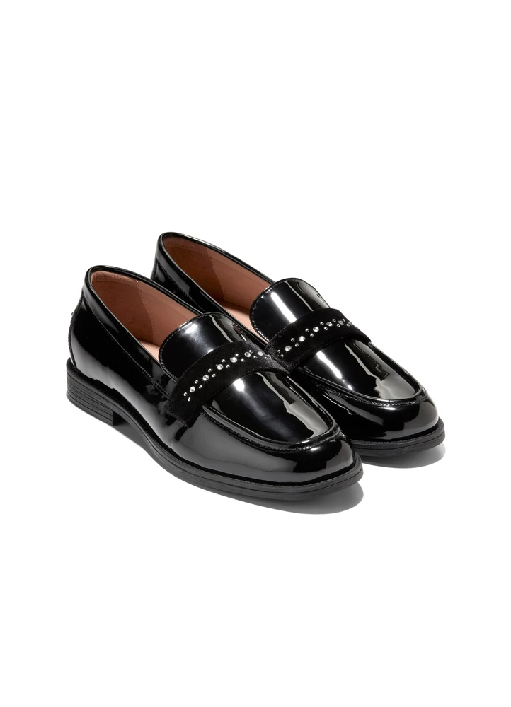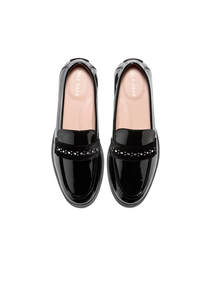 A traditional slip-on ornamented in a slightly untraditional way: The Stassi Embellished Loafer keeps the shape, construction, and comfort of the classic collegiate moccasin but does it in black patent ornamented with a constellation of crystal studs on a velvet keeper.