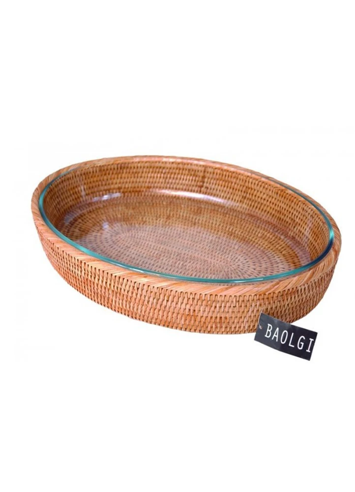 Oval rattan platter with pyrex dish, d: 40 x 30, h: 6cm.