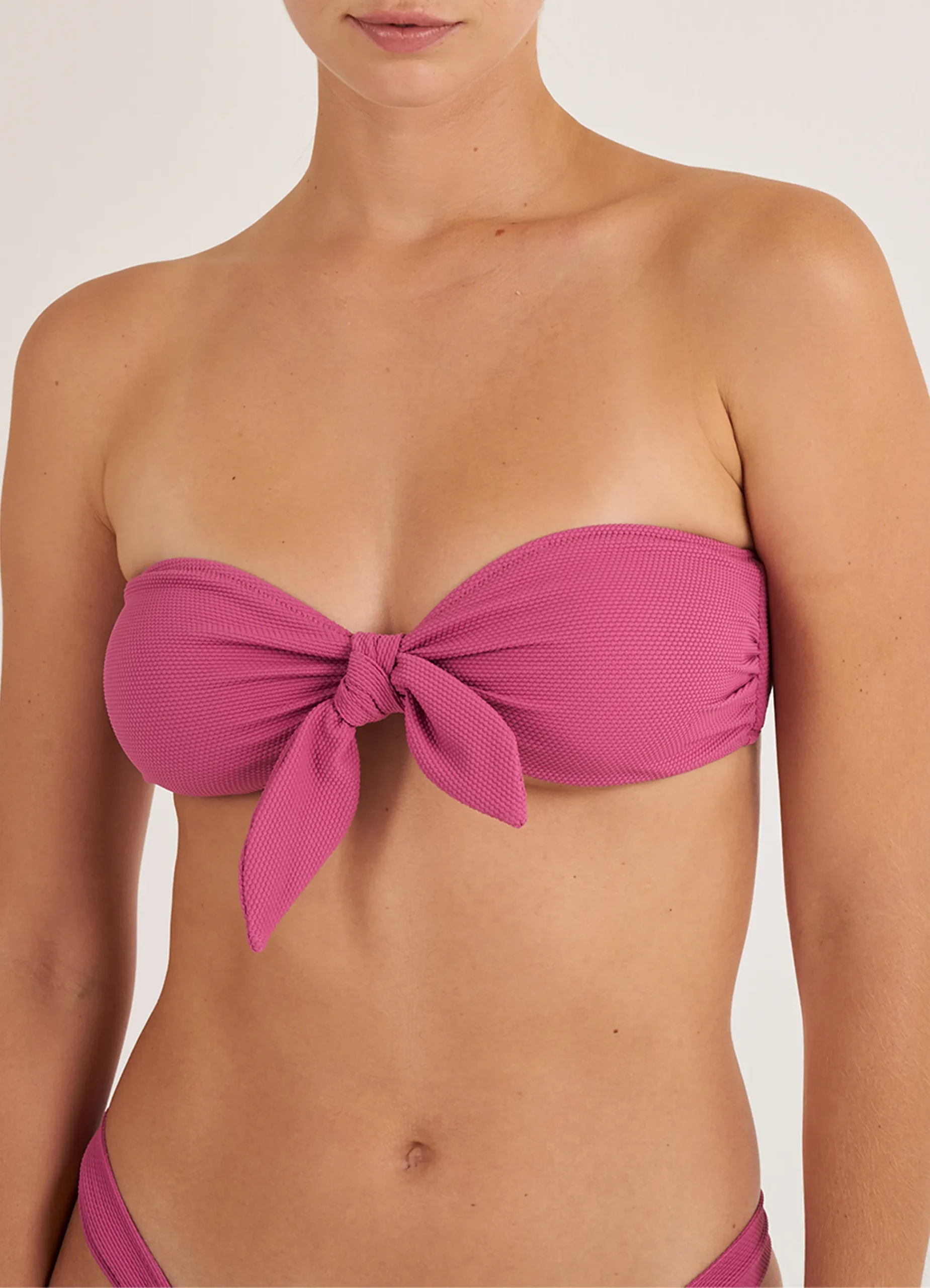 This bandeau-style bikini top features a decorative center bow and a multi-position metal back clasp for a customizable and secure fit. Crafted from structured raspberry piqué fabric, it combines elegance, support, and durability. Designed with removable foam pads and a soft lining for extra comfort, it pairs perfectly with the matching Bottom AWOHS26BMMOPI03-70 for a complete look.
