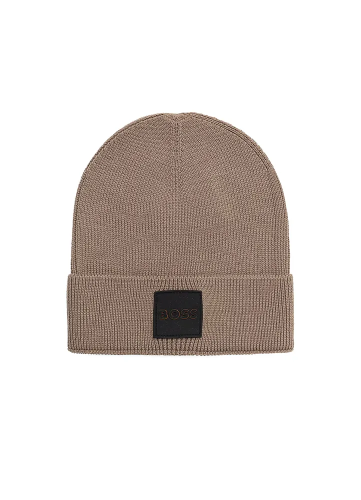 Foxxy knitted wool mix beanie with square boss logo rubber badge.