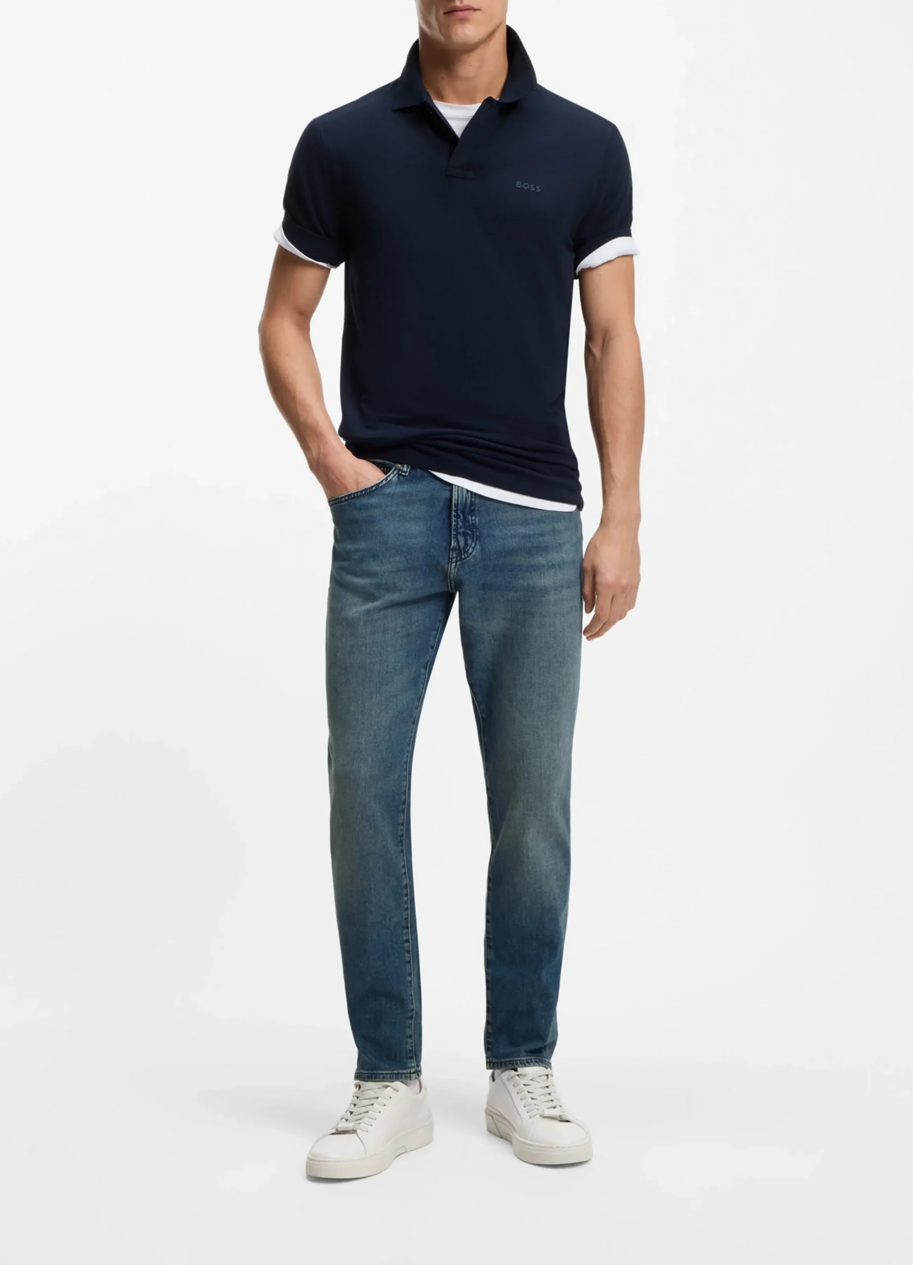 In a fresh blue tone, these BOSS Menswear jeans are cut to a classic tapered fit. Stretch denim for comfort in movement. Double B monogram.