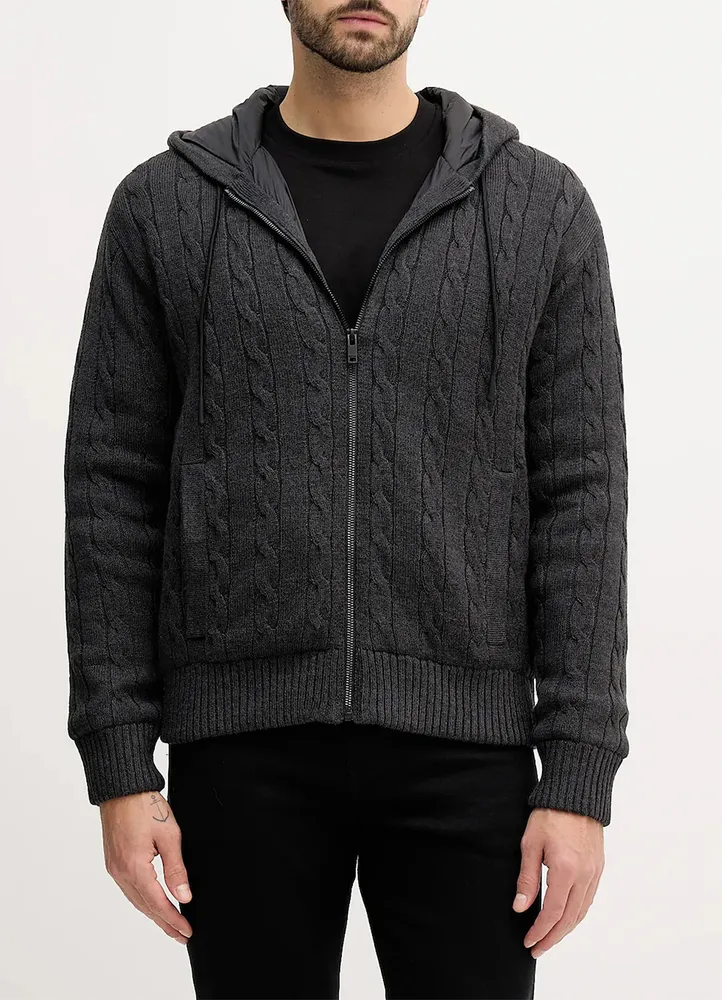 | Knitwear Cardigan. Knitted cable cardigan jacket from the BOSS Orange collection. This lightly insulated jacket is made of stretchy fabric for complete freedom of movement. Virgin wool is lighter than traditional wool and is characterized by exceptional softness, suppleness, and durability. – The hood is adjustable with a drawstring for added protection against wind and rain. – Two side pockets with snap closures. – The sleeves and hem are finished with comfortable elastic cuffs. – This lightly insulated jacket is lined. 47% Polyacrylic, 47% Virgin Wool, 5% Polyamide, 1% Elastane |