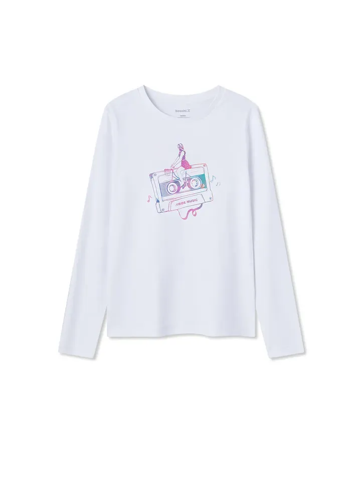 Long-sleeve solid T-shirt with a round neckline. Coloured pattern printed in the front.