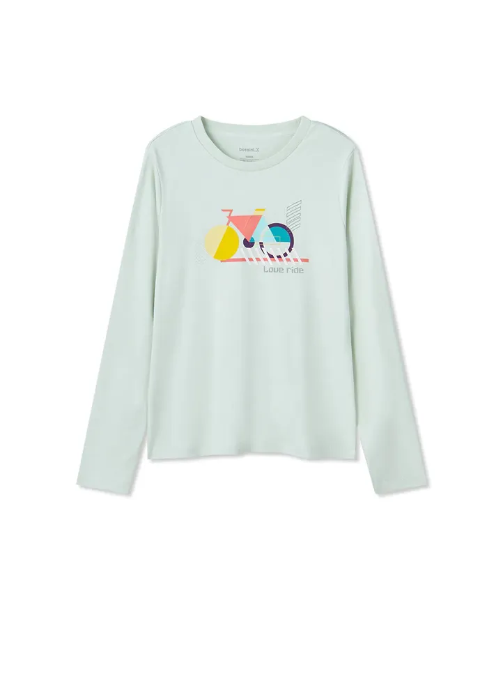 Long-sleeve solid T-shirt with a round neckline. Coloured pattern printed in the front.