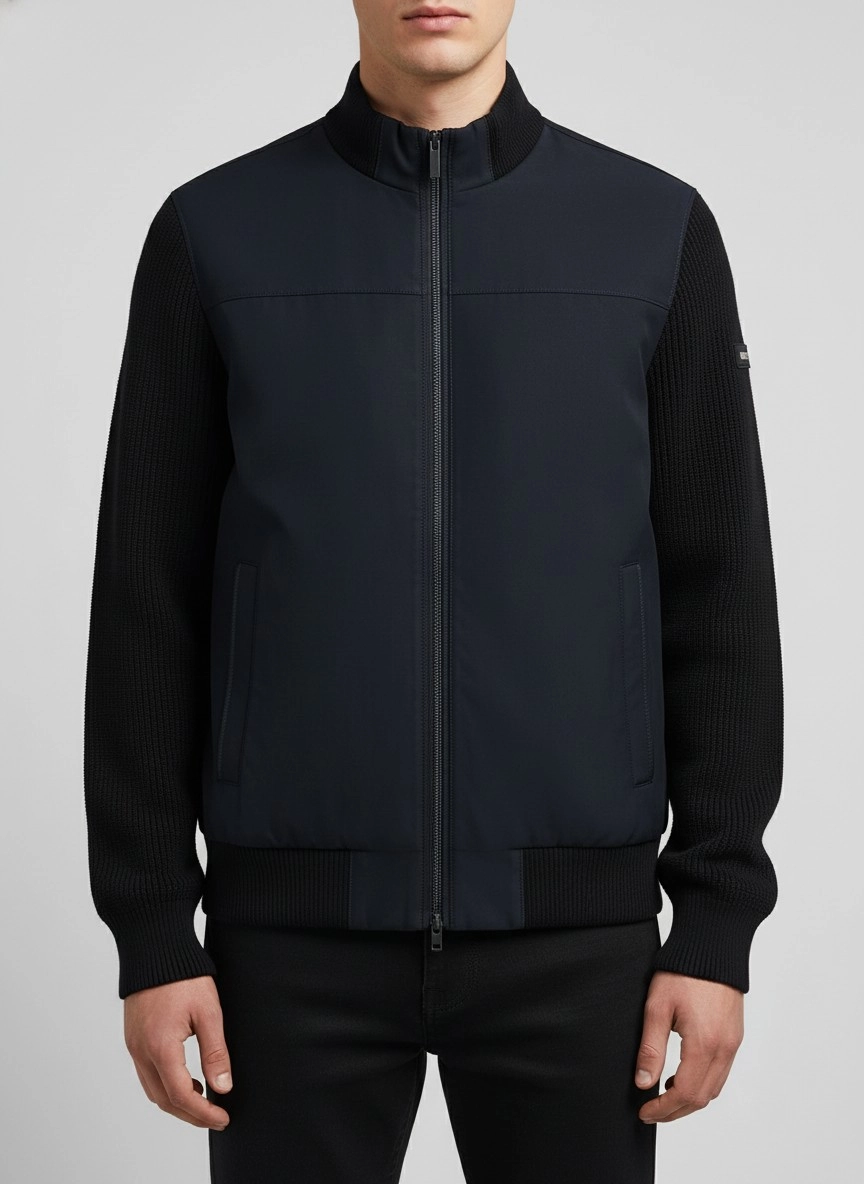 Short Jacket.Suede front full zip short jacket with knitted sleeves.70% Polyester, 30% Viscose.