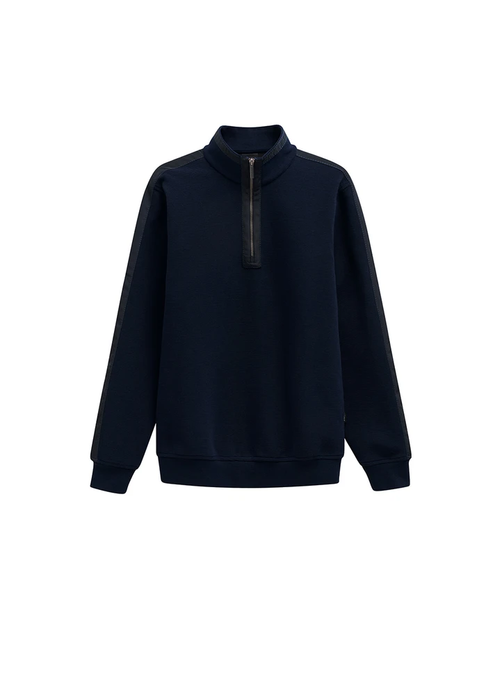 Sweatshirt.Half zip vertical tonal pinstriped sweatshirt with nylon tape on shoulders and sleeves.50% Cotton, 45% Polyester, 5% Elastane.