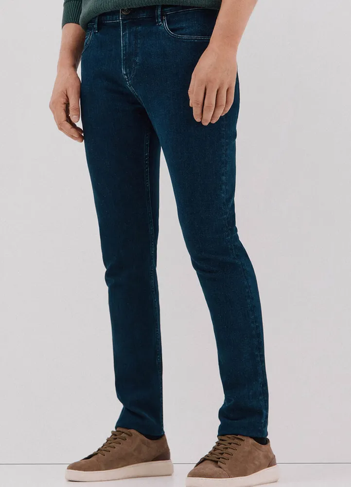 Slim fit jeans featuring a dark indigo denim wash with a classic button and zipper closure.