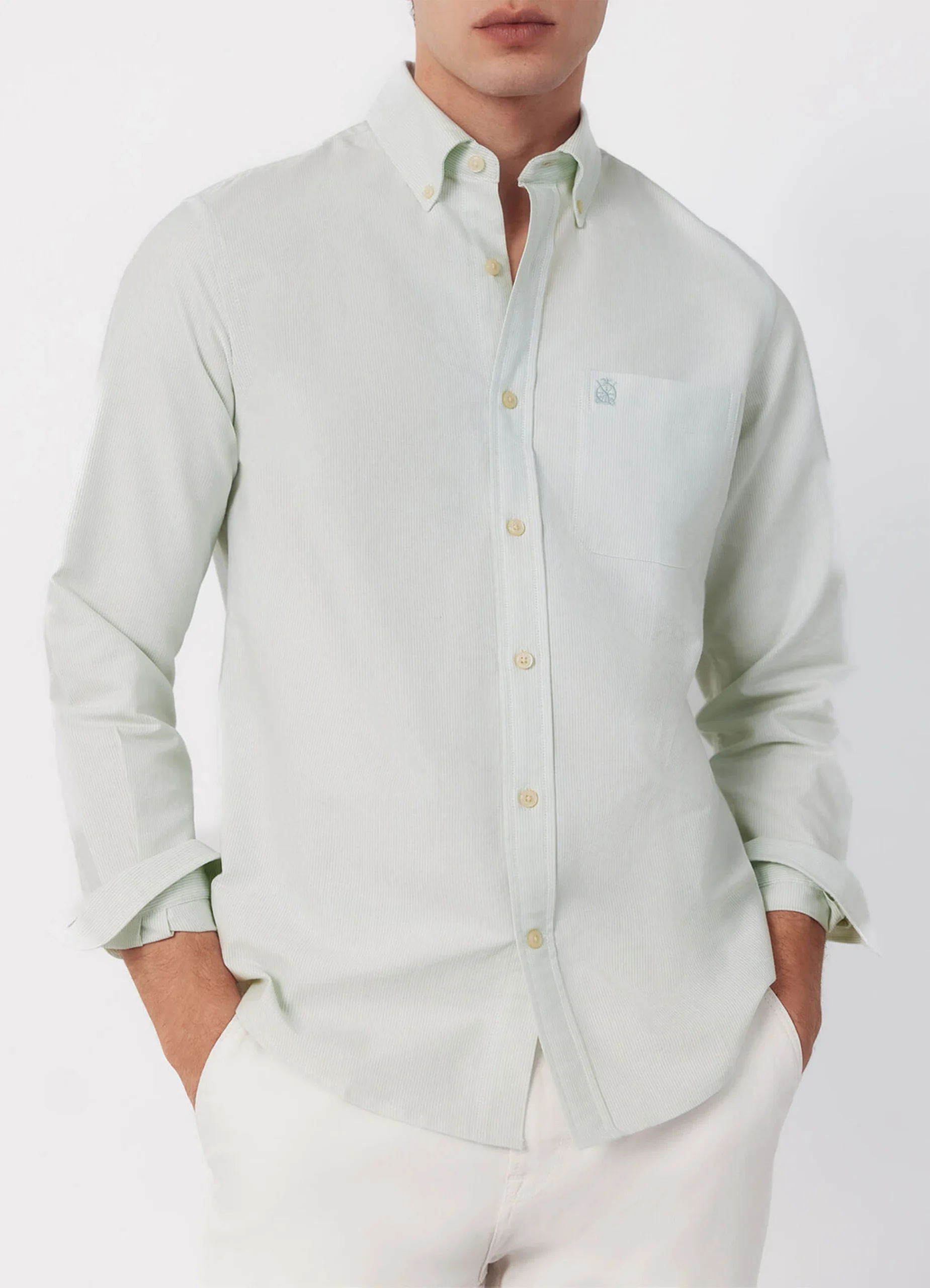 Long sleeve, regular fit shirt is made from 100% cotton oxford fabric in a candle stripe pattern, washed for added softness, and featuring a buttoned collar with a chest pocket embroidered with a logo.