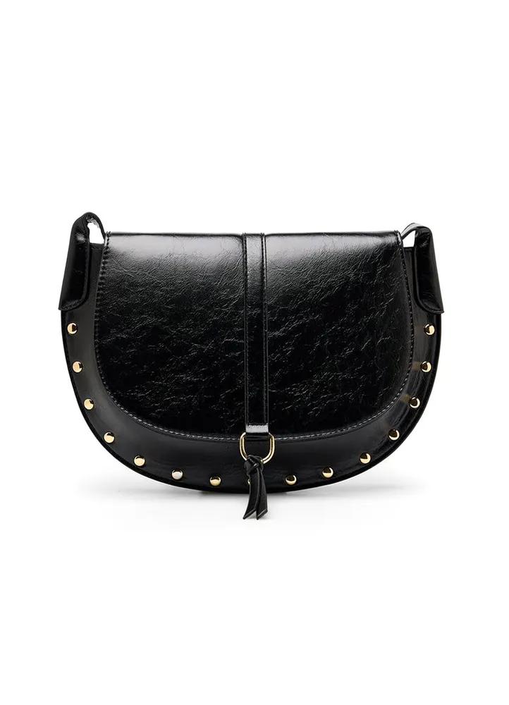 This shoulder bag features a flap design, adjustable handle with buckle, studded side details, magnet button closure, inner lining, and an interior zip pocket.
