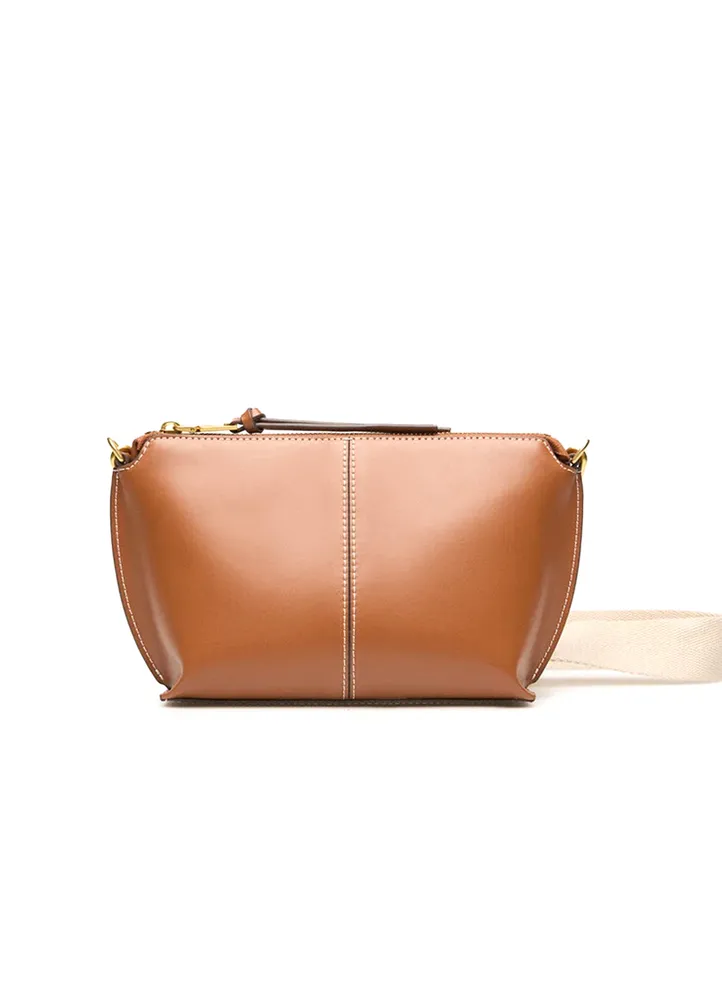 Cross bag featuring double adjustable handles one in matching material and one in fabric, contrasting stitching, an inner lining, and an inner pocket.