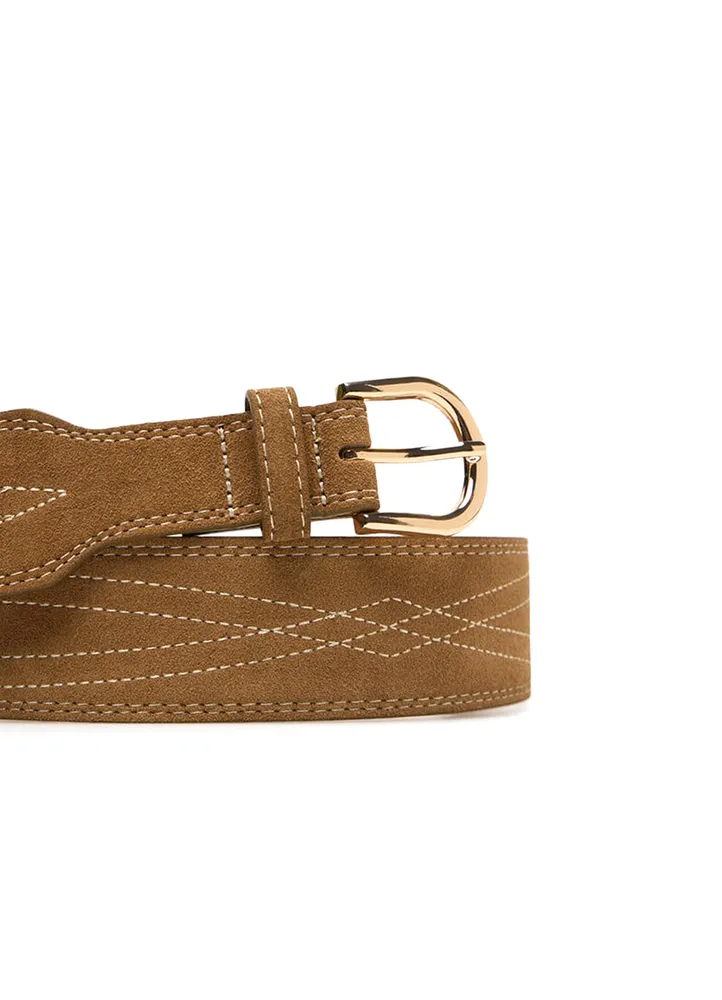 Belt featuring contrasting stitching, and a gold metal buckle.