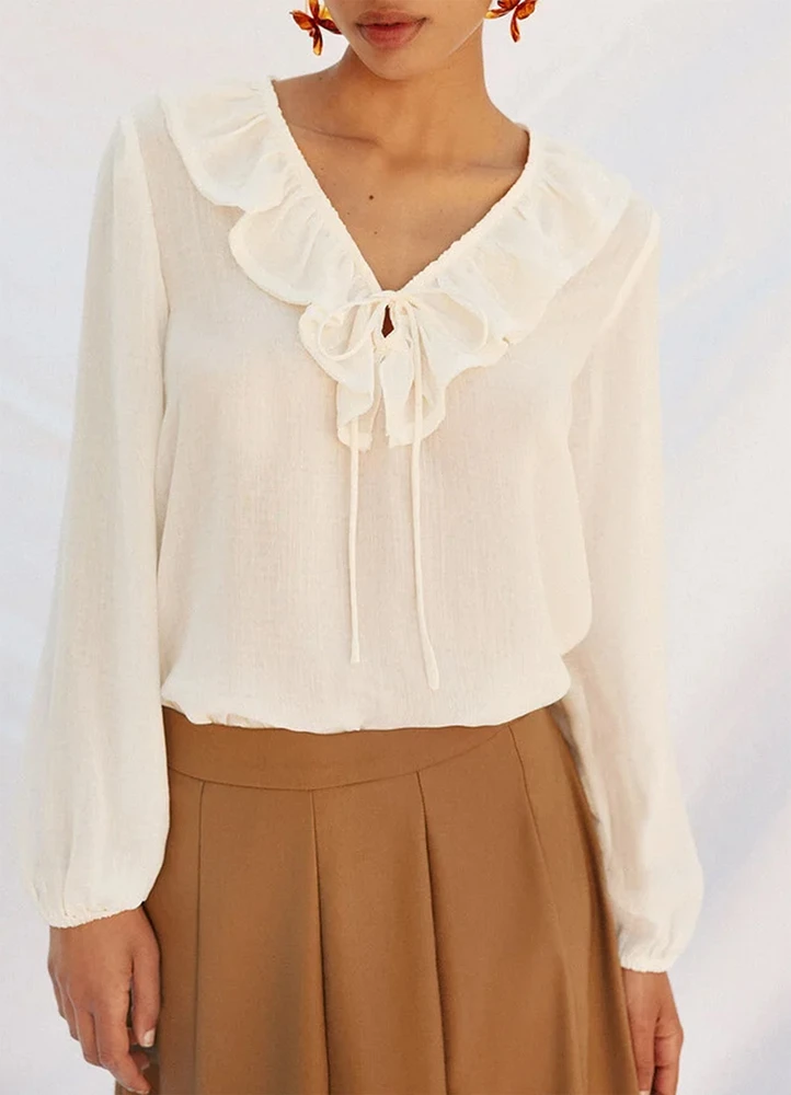 This long‑sleeve blouse features an adjustable V‑neck with drawstring, ruffle detail in matching fabric, and voluminous sleeves finished with elastic cuffs.
