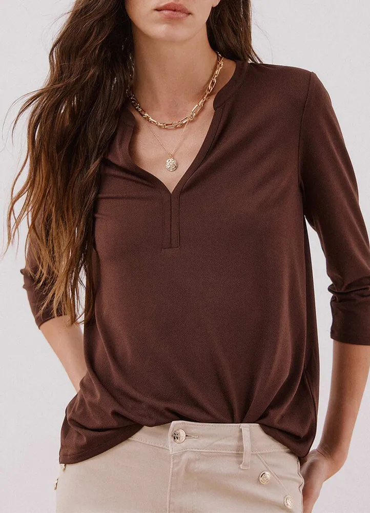 Long sleeve, V-neck t-shirt featuring a Mao collar with a strapped, and elastic, comfortable fabric.