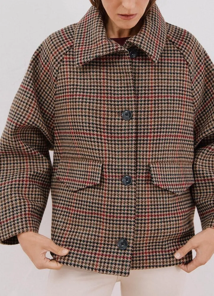 Single breasted, short, checked coat with vivid exposed seams, flap pockets with buttons, a central button closure, and a classic shirt collar.