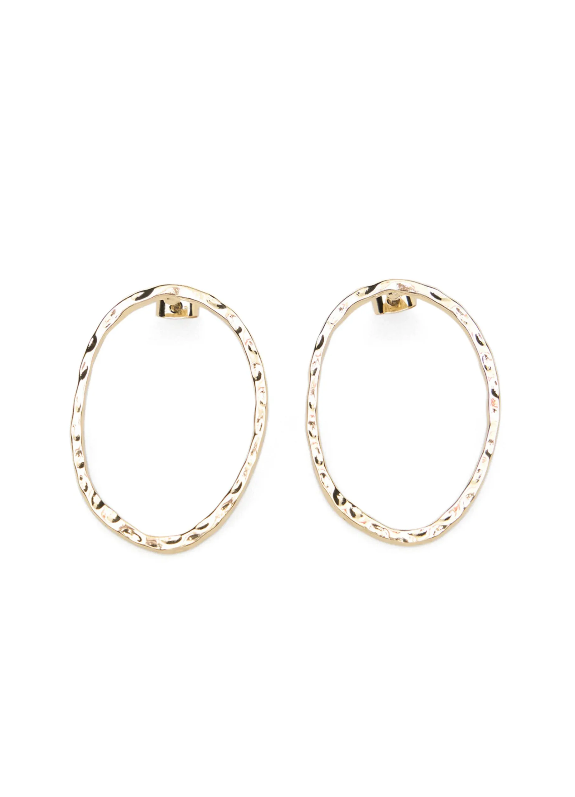 Gold metal hoop earrings with a hammered front design, and a nut closure.