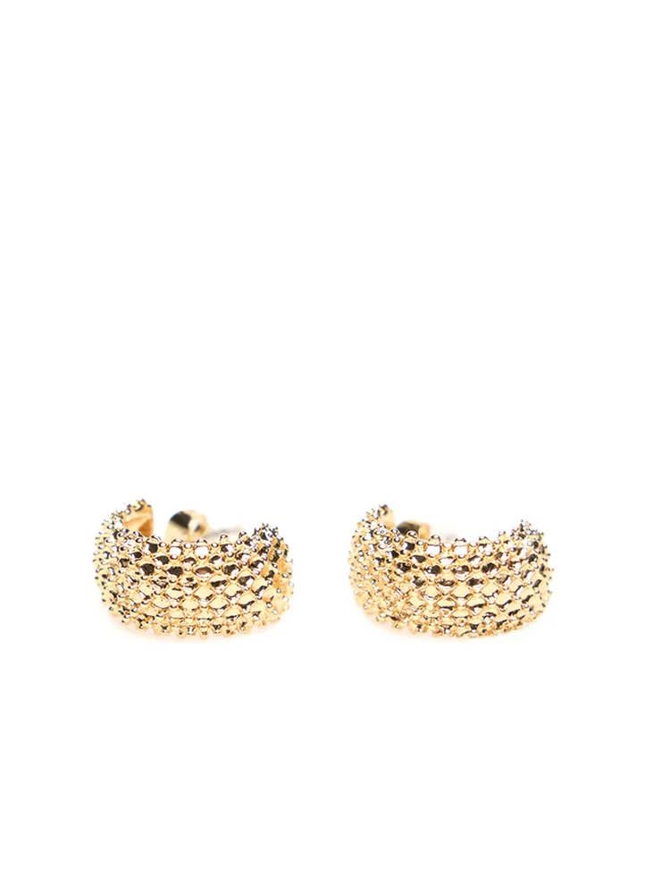 Golden metal earrings featuring a hoop texture, and a secure nut closure.