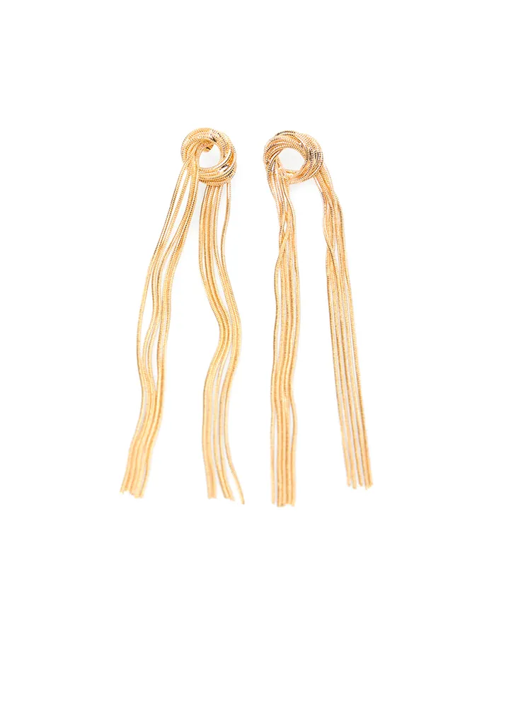 Golden metal chain earrings featuring a knot detail at the top, from which four chains elegantly hang from each end.