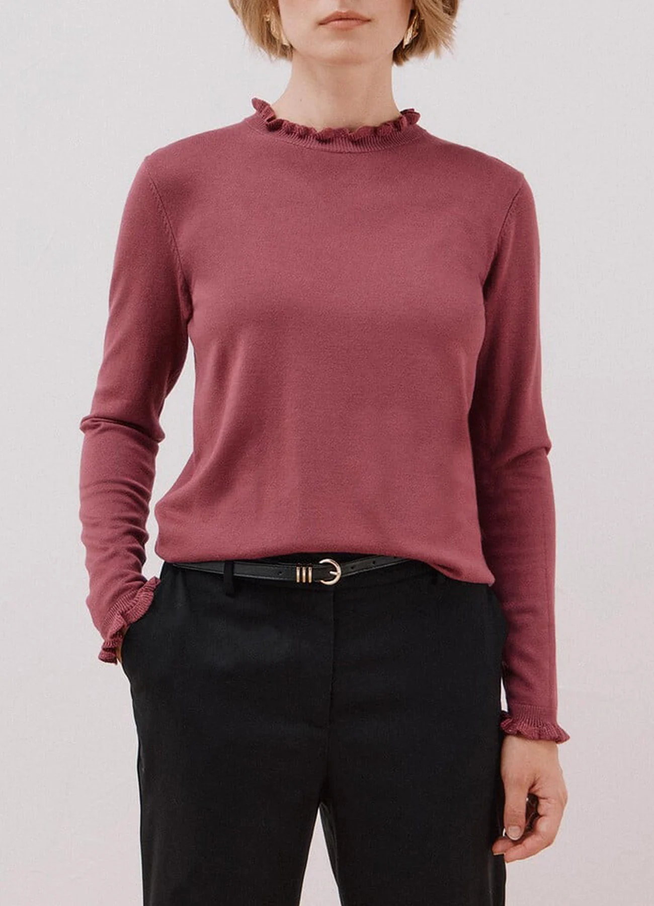 Long sleeve, crew neck, straight fit, knit sweater featuring mini ruffles and lurex on the neckline and cuffs.