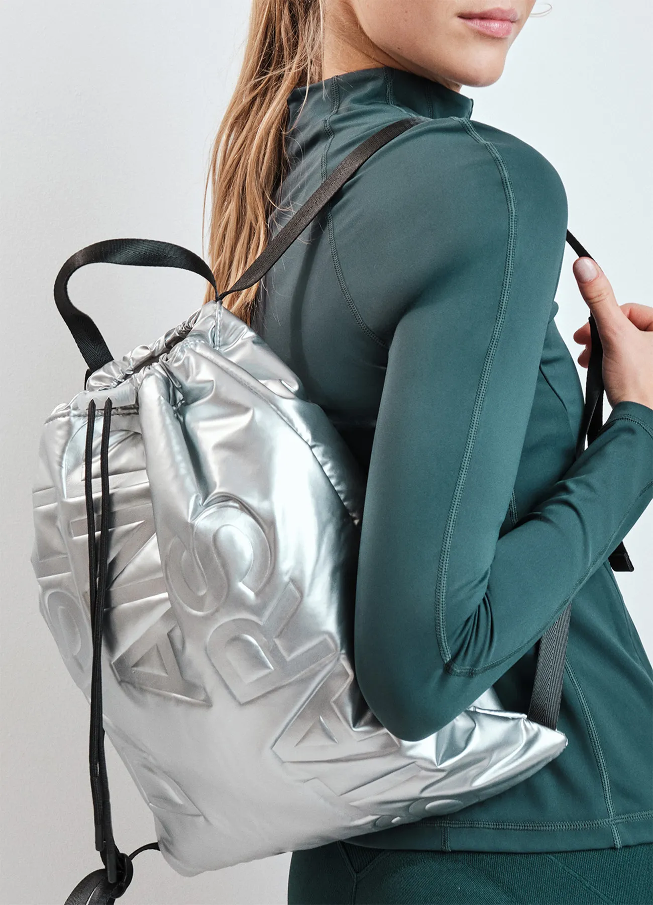 This metallic silver backpack features heat-sealed padding, making it perfect for the gym or travel.