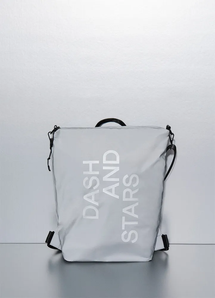 – Travel backpack in grey technical fabric with a silver metallic effect and satin finish.