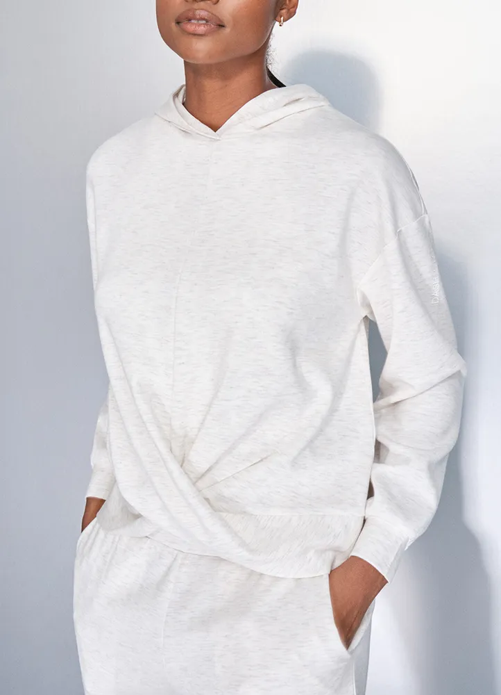 -Sweatshirt with soft touch fabric with dropped sleeves. With hood and cuffs. Draping detail on the front hem.