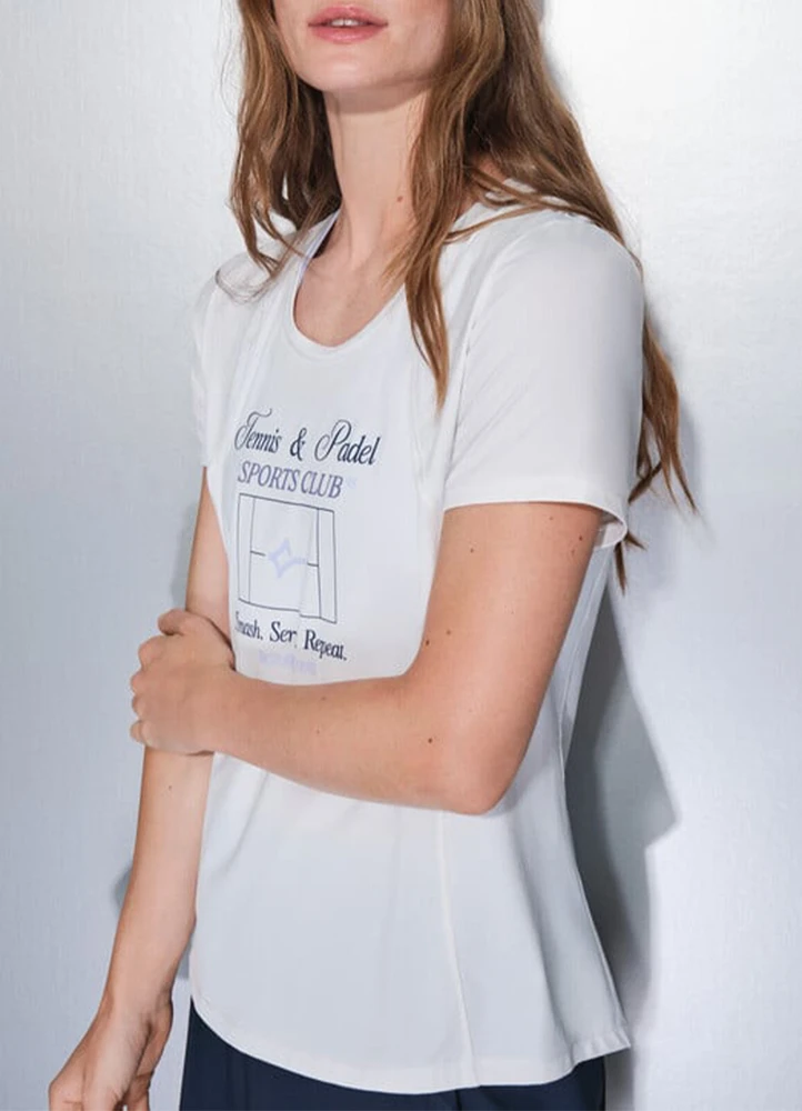 – Short-sleeved, fitted T-shirt crafted from white microfibre, featuring breathable fabric panels on the sides and sleeves for added comfort.