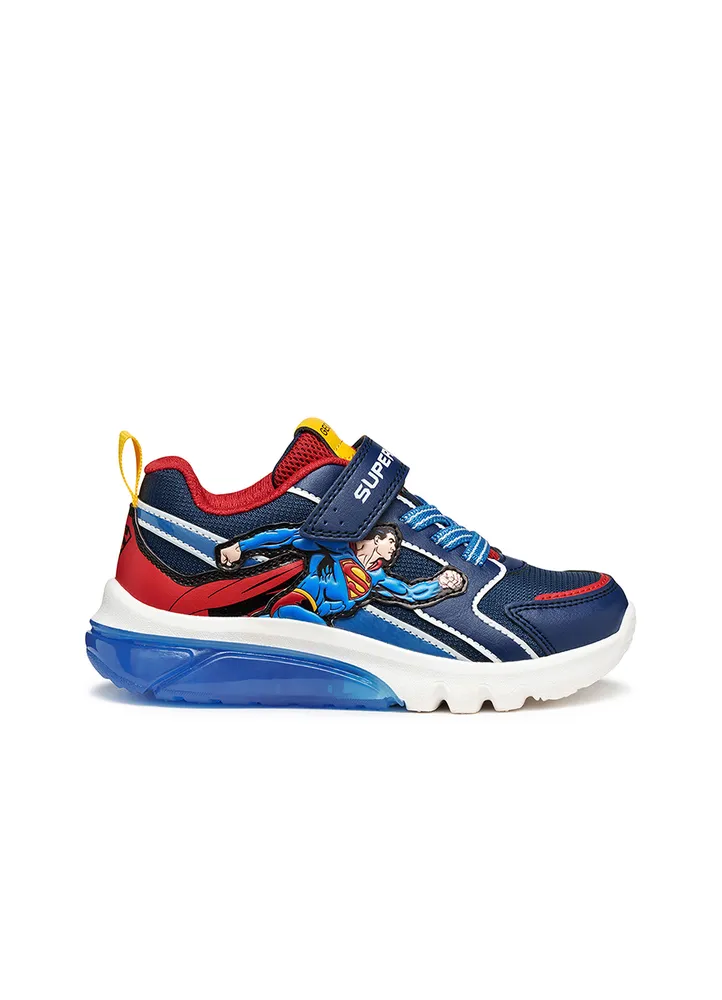 | CIBERDRON Ciberdron is a sneaker for boys with an active modern design which takes its cues from the heroic Superman and was devised under the partnership between Geox and the Warner Bros. Crafted from a leather-effect material and fabric, this piece of footwear has lights fitted into the sole that can be activated with a special switch. Leather upper |