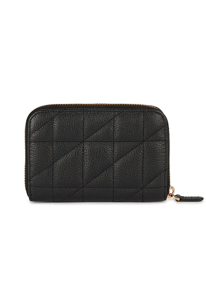 Women’s mid-size accordion wallet with a practical zip closure, a zipped coin pouch and banknote partition. It has been crafted from refined tumbled leather in a quilted pattern and embellished with a milled stud detail. Dimensions: L 15 cm x W 2.5 cm x H 9.5 cm.
