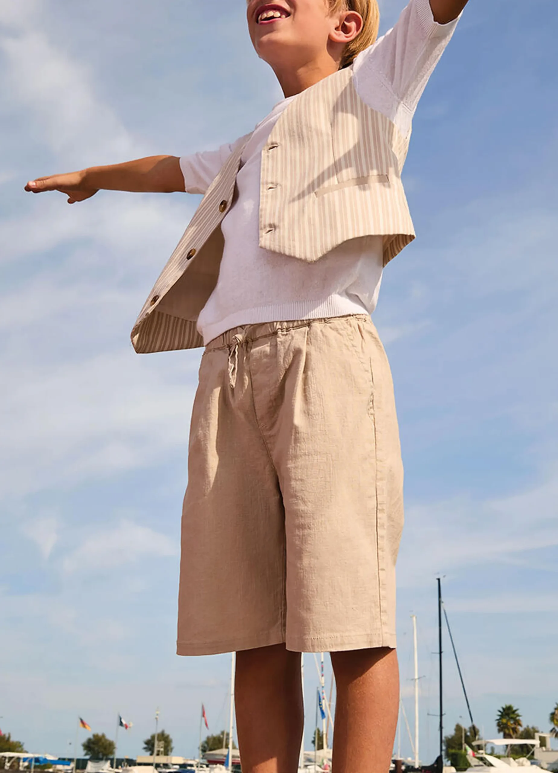 iDO boys’ shorts made of linen and cotton with elastic waistband and drawstring. Adjustable waist with internal elastic loop.
