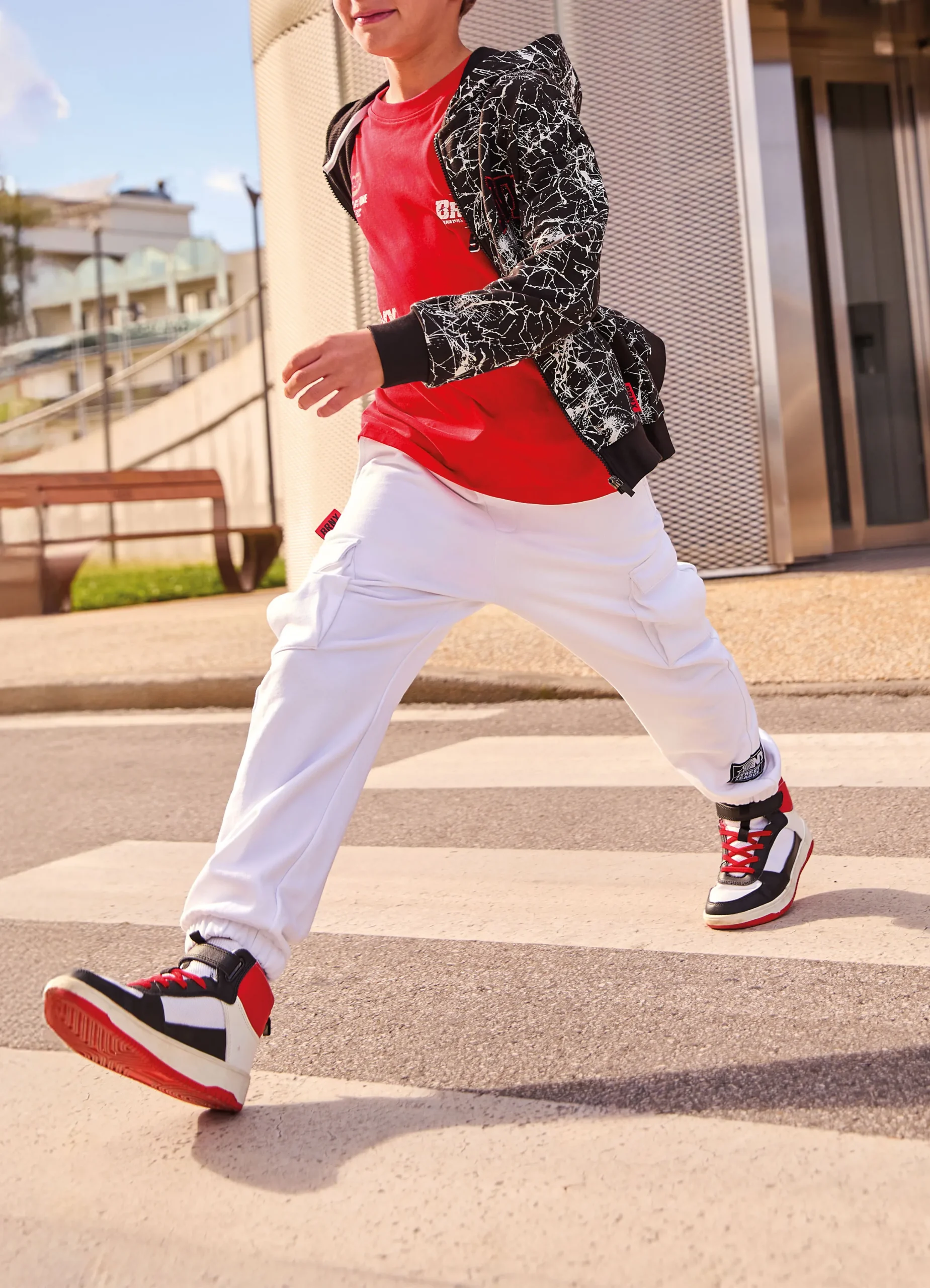 Fleece long pants with large side pockets. Elastic waistband and drawstring. Oversized fit.