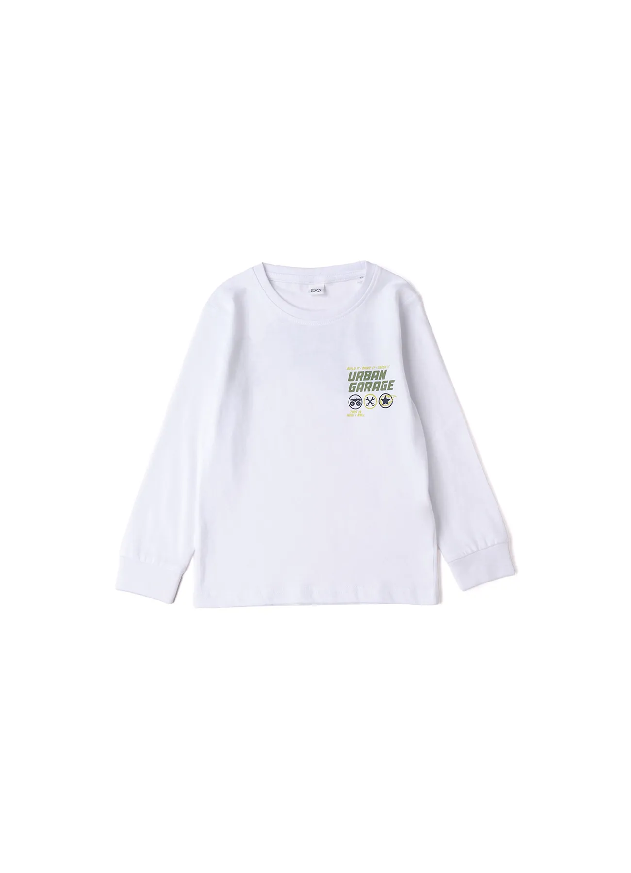 Long-sleeved crew neck for children with urban garage print on chest and vroom back print.