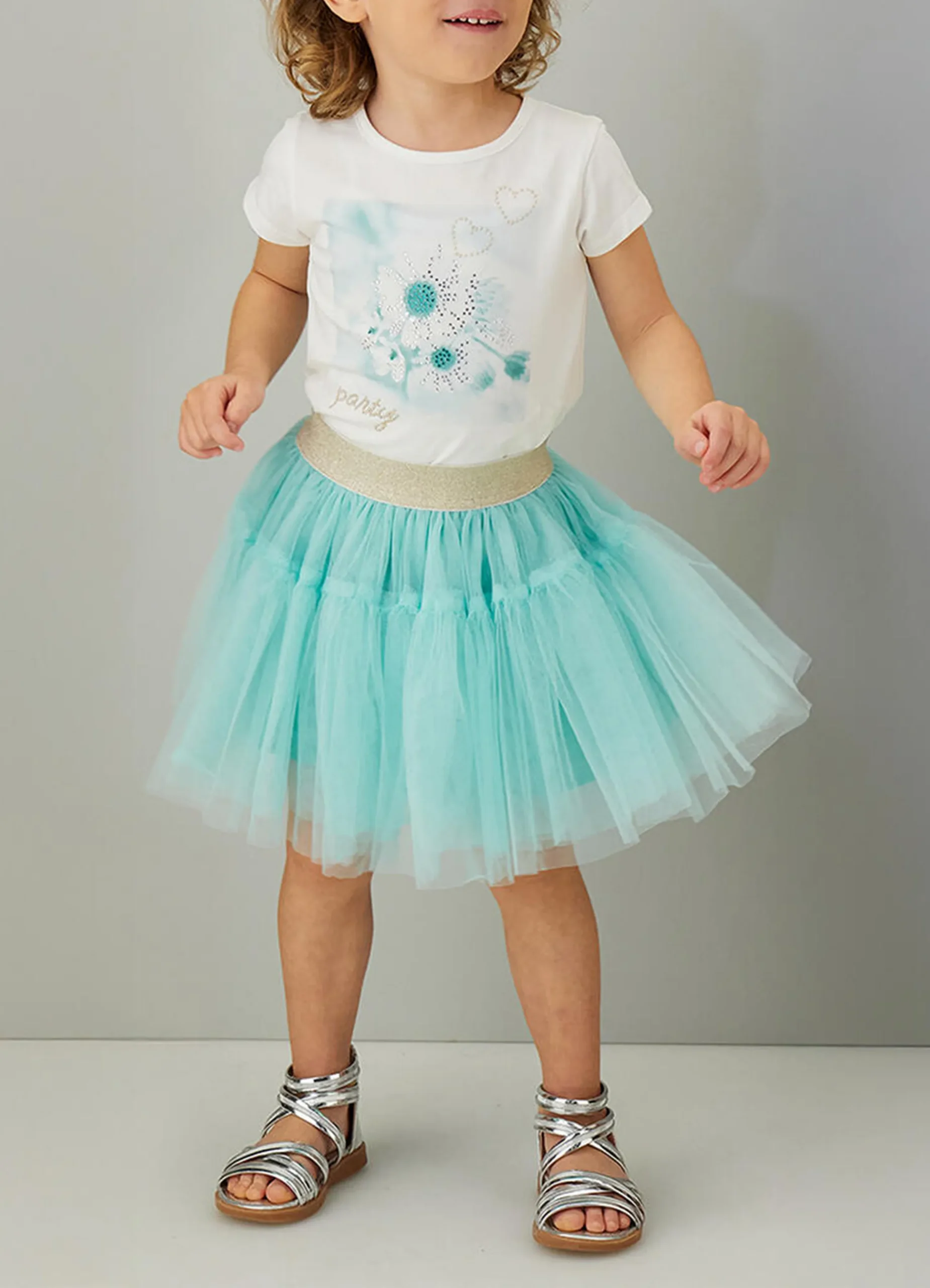 iDO short-sleeved outfit for girls consisting of a T-shirt and skirt. The T-shirt is made from stretch cotton jersey with a rhinestone print. The skirt is made from tulle with lurex elastic and a cotton lining. Knee length.
