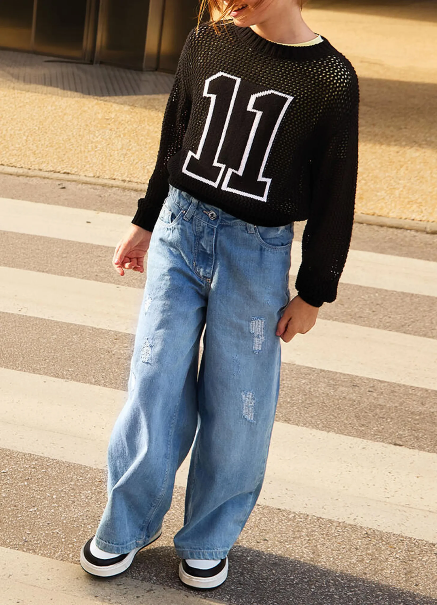Denim pants for girls by iDO. Style embellished with rips and inner lining. Zip and button closure. Adjustable waist with inner elastic. Wide fit.