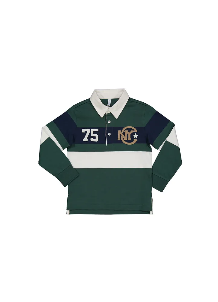 Poloshirt LS.Stripe block poloshirt with contrast collar and 75 NY badge.100% Cotton.