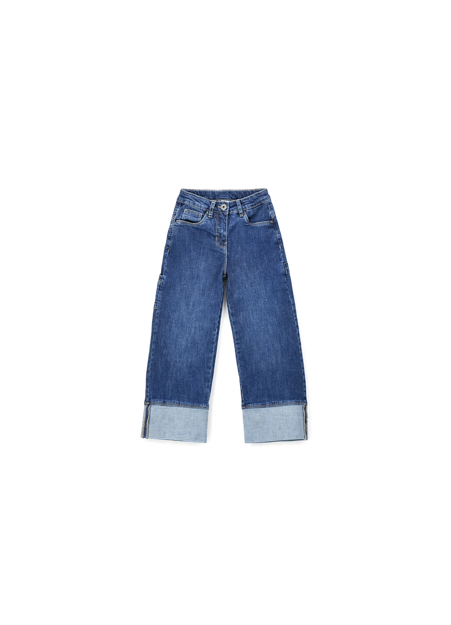 Long stretch cotton denim pants for girls by iDO. Zip and button closure. Adjustable waist with internal elastic. High-waisted style with a wide fit.