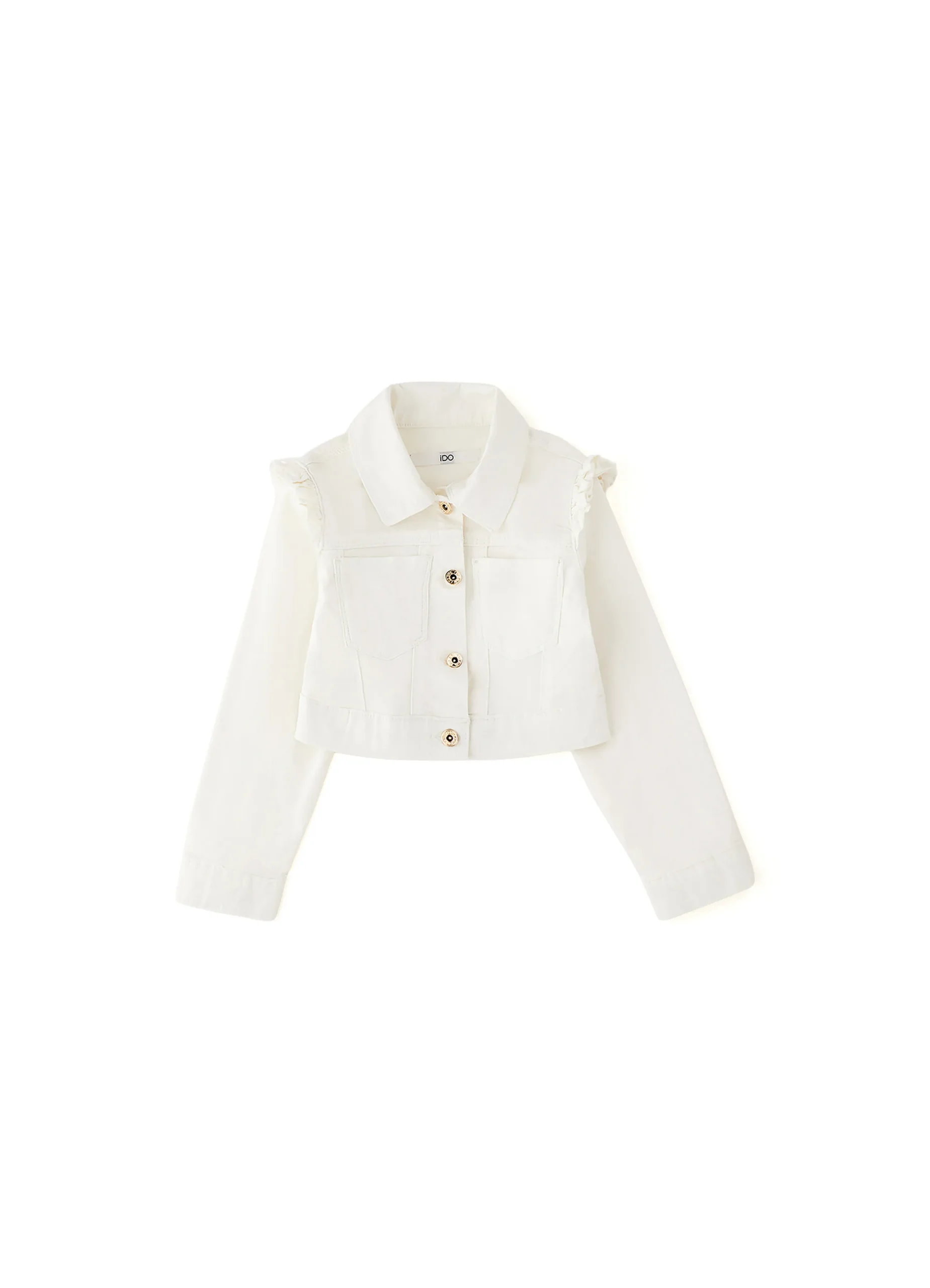 iDO girls’ jacket made from stretch cotton twill with ruffles on the shoulders, rhinestones, and embroidery on the back.