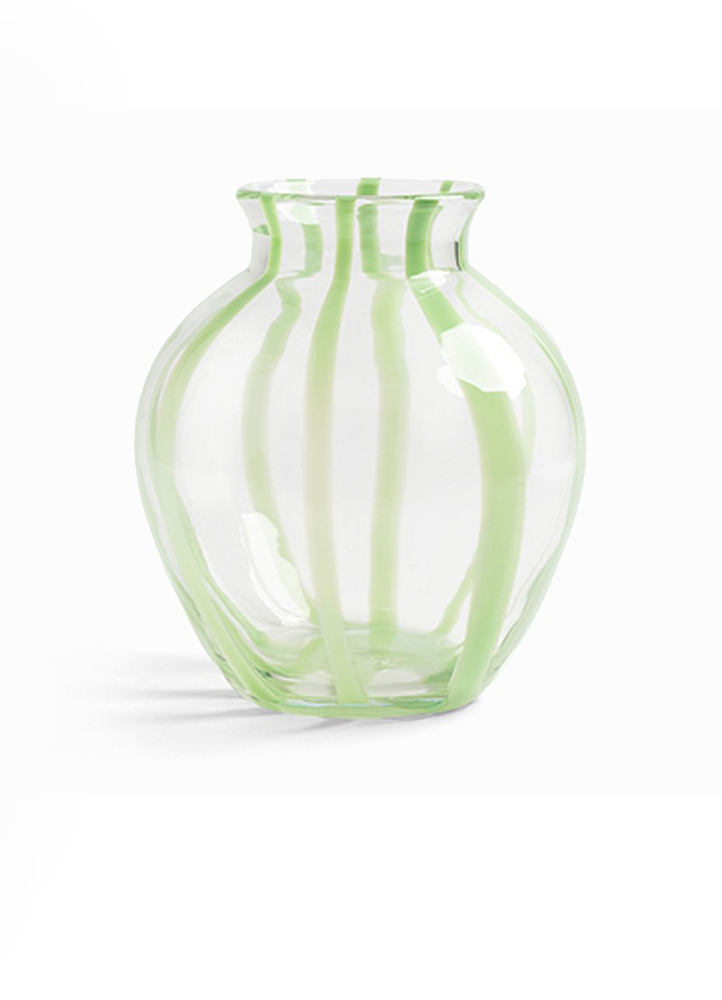 VASE, YOGU, GLASS, WITH SPIRAL GREEN LINES, D: 23.5 X 20 CM, FOR CLEANING RINSE WITH LUKEWARM WATER.