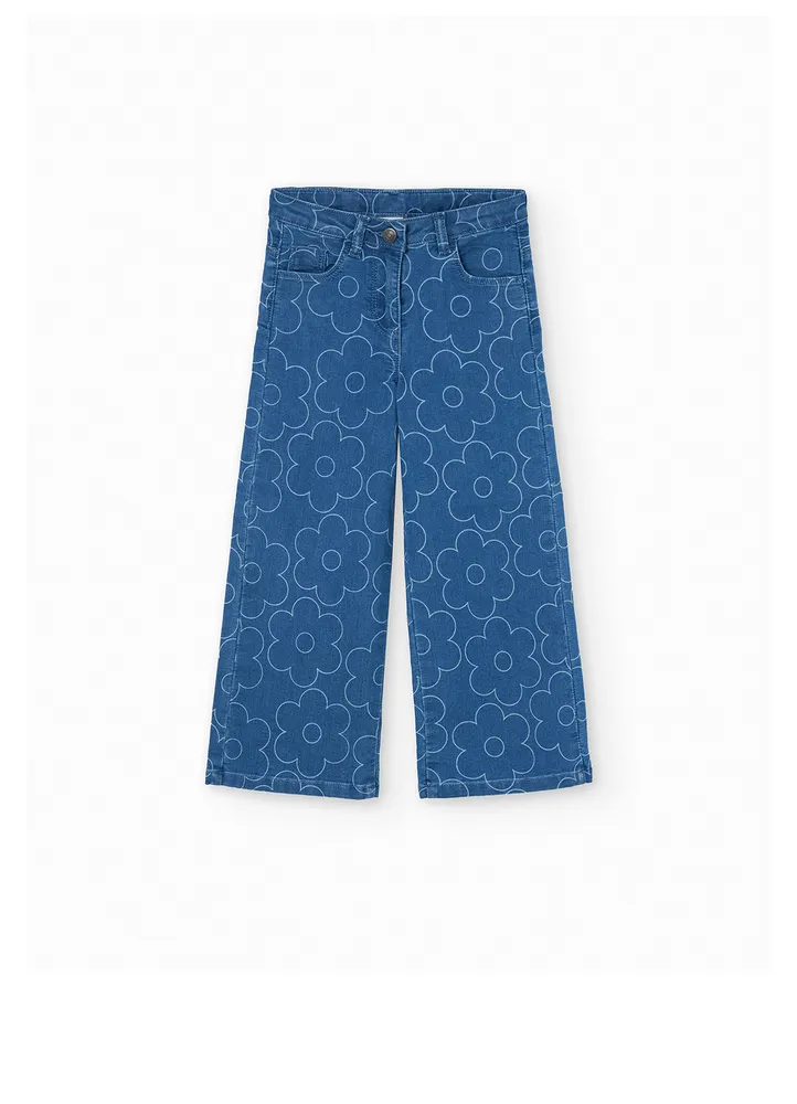 Jeans.Wide leg washed denim with flowers jeans .79% Cotton, 20% Polyester, 1% Elastane.
