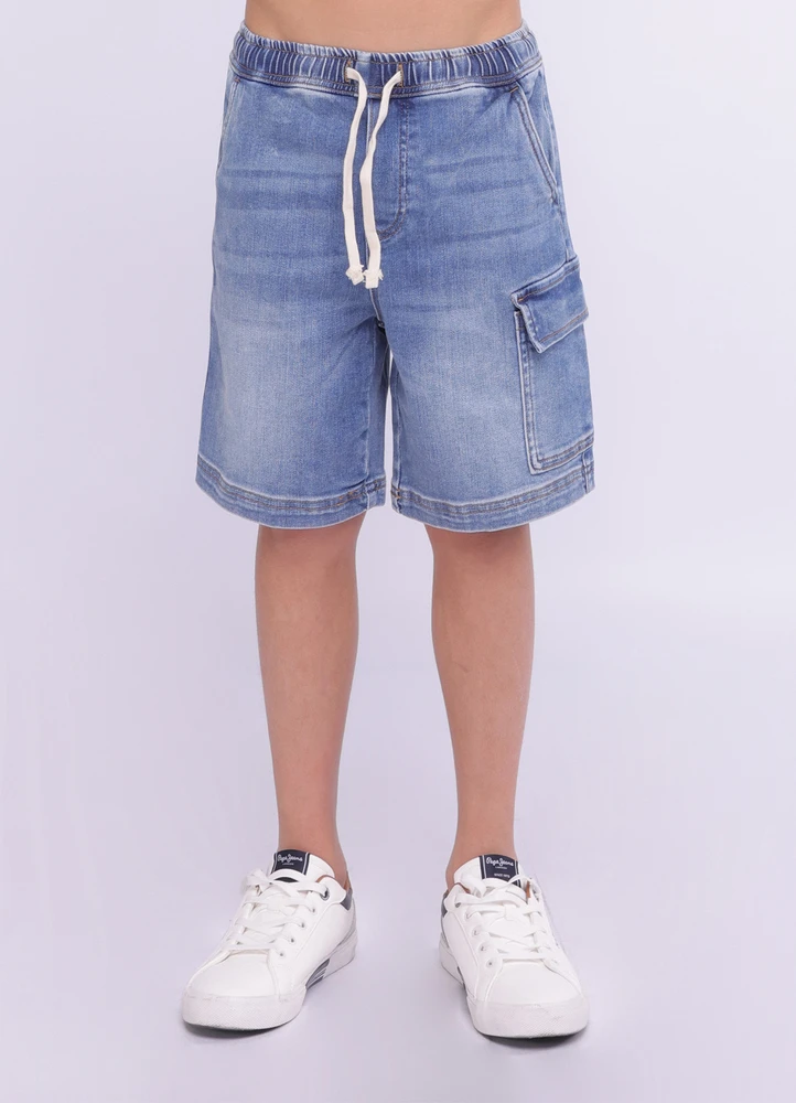 Drawstring denim cargo shorts.