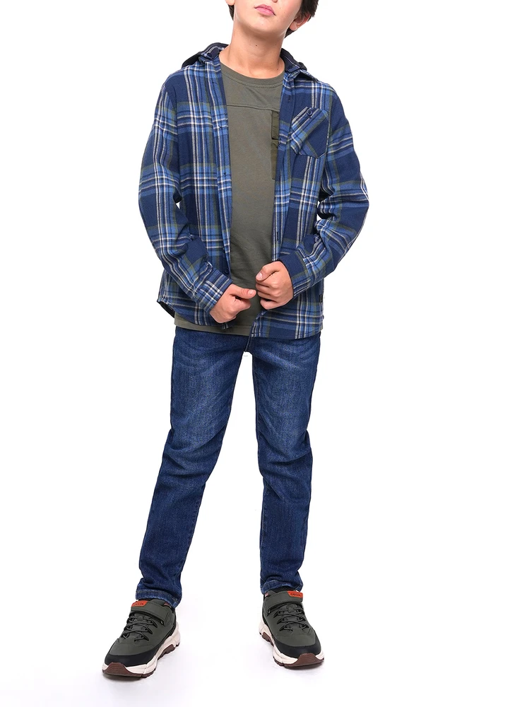 Plaid checked shirt with removable jersey hood and chest pocket.